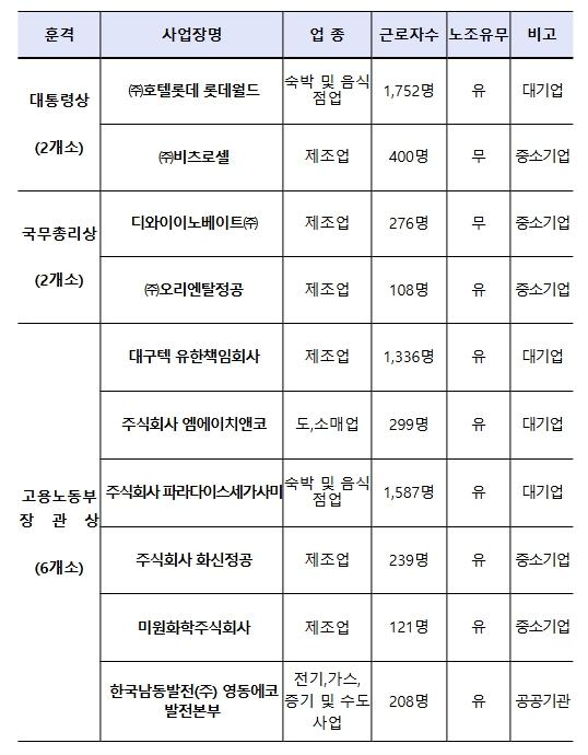 대통령상은 (주)호텔롯데 롯데월드, (주)비츠로셀, 국무총리상은 디와이이노베이트(주), (주)오리엔탈정공, 고용노동부 장관상은 대구텍 유한책임회사, 미원화학주식회사, 주식회사 엠에이치앤코, 주식회사 파라다이스세가사미, 주식회사 화신정공, 한국남동발전(주)영동에코발전본부가 선정의 영예를 안았다.