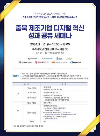 충청북도는 21일 청주대학교 주관으로 스마트제조 고급인력 양성사업의 성과공유를 위한 충북 제조기업 디지털 혁신 성과공유 세미나를 개최했다고 밝혔다.