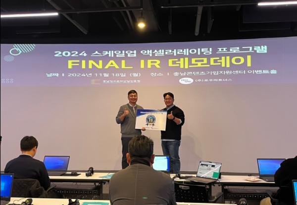 충남정보문화산업진흥원은 '2024 스케일업 액셀러레이팅 프로그램'의 일환으로 지난 18일 충남콘텐츠기업지원센터에서 '파이널 데모데이'행사를 개최했다고 밝혔다.