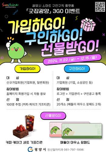 광양시는 일자리 종합 포털사이트인 스마트 구인구직 플랫폼 ‘굿잡광양’ 활성화를 위해 3GO(가입하GO!구인하GO!선물받GO!) 이벤트를 추진한다고 21일 밝혔다.