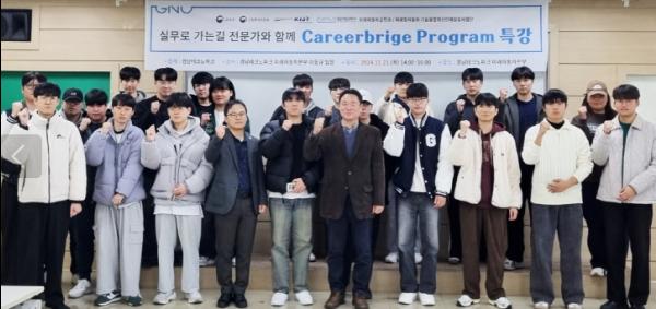 경남테크노파크 미래자동차본부 이동규 팀장은 경상국립대 출신 동문으로서, 융합전공 3, 4학년 학생들에게 취업을 위한 조언으로 서류에서 어학 점수와 자격증을 강조했다.