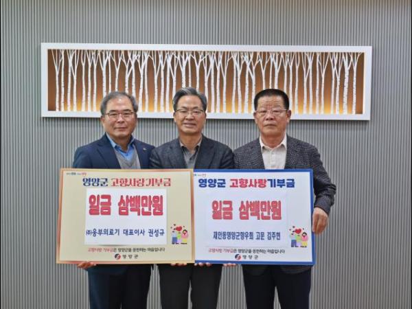 김주현 재안동영양군 향우회 고문과 권성규 ㈜웅부의료기 대표가 11월 22일 영양군청을 방문하여 고향사랑기부금을 각각 3백만 원씩 기탁했다.