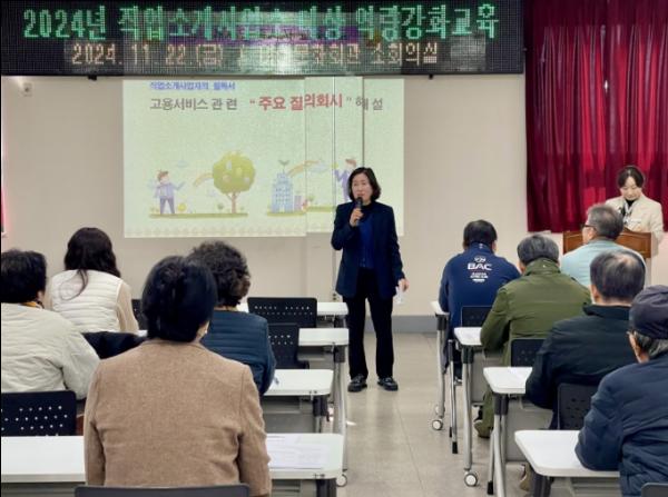 교육 과정은 ▲직업상담기법 ▲직업안정법 ▲불법 직업소개행위 ▲사회적 책임 등 종사자의 역량 강화 ▲관련 법령 ▲윤리 의식 등 직업소개사업소 운영 전반에 관한 내용을 포괄하여 전체적인 고용 서비스의 질적 향상을 도모했다.