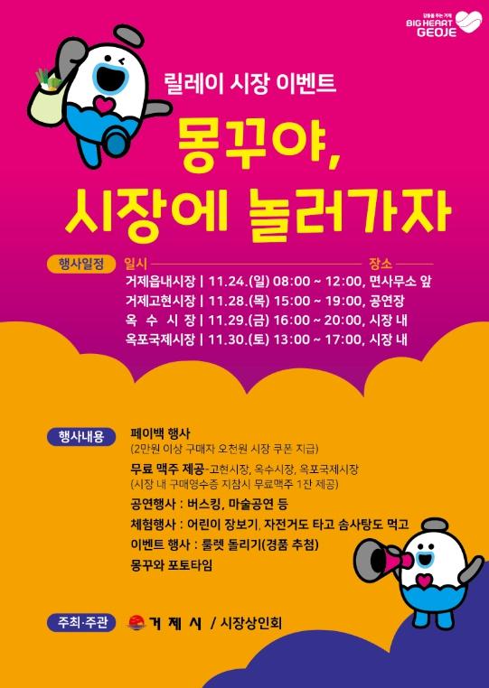 거제시에서 지난 24일부터 오는 30일까지 릴레이 시장 이벤트를 진행한다. 거제의 새로운 캐릭터 몽꾸가 시장에 놀러간다는 주제로 요일별 각 시장에 몽꾸가 등장한다.
