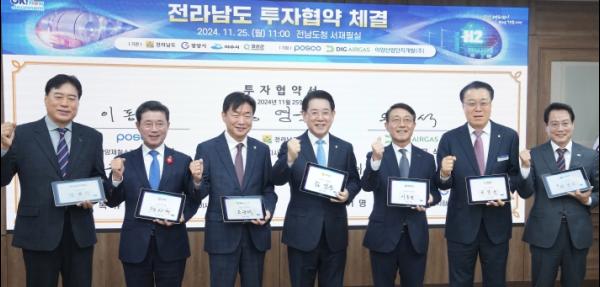 전라남도는 25일 도청 서재필실에서 ㈜포스코, 디아이지에어가스㈜ 등 2개 기업과 1조 2천42억 원 규모의 투자협약을, 이양산업단지개발㈜과 60만 5천㎡ 규모의 산업단지 개발 업무협약을 했다.