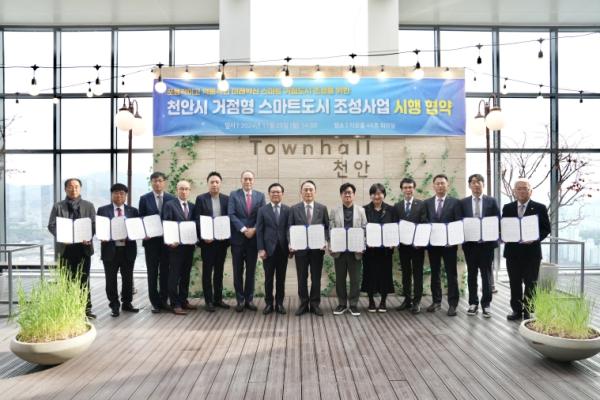 천안시는 지난 25일 천안타운홀에서 박상돈 천안시장 등이 참석한 가운데, 11개 컨소시엄과 거점형 스마트도시 조성사업 시행협약을 체결했다.