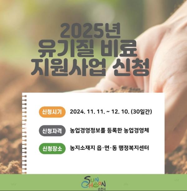 순천시는 농가의 유기질비료 구입비 부담을 줄이고 농약 및 화학비료 사용을 줄이기 위해 추진되는 2025년 유기질비료 지원사업 신청·접수를 오는 12월 10일까지 받는다고 밝혔다.