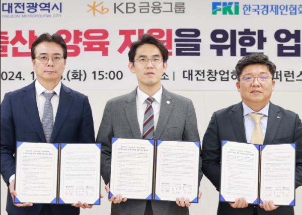 대전시는 26일 대전창업허브(옛 충남도청 내)에서 KB금융그룹, 한국경제인협회와 ‘소상공인 출산·양육 지원을 위한 업무협약’을 체결했다.