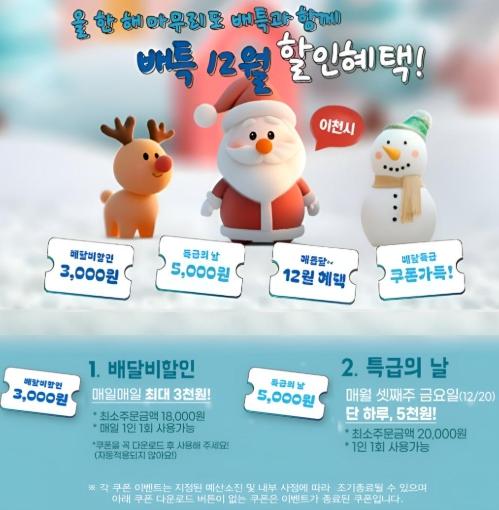 주요 이벤트 내용은 매일 1인 1회 한정 배달비 3,000원 쿠폰과 매월 셋째 주 금요일(12.20.) ‘특급의 날’에 5,000원 쿠폰을 제공한다.
