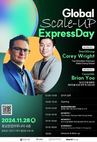한편, ‘글로벌 스케일업 익스프레스 데이’는 충남창경센터 홈페이지 공지사항에서 확인할 수 있으며, 참가 신청은 포스터의 큐알코드 또는 구글폼 을 통해 가능하다.