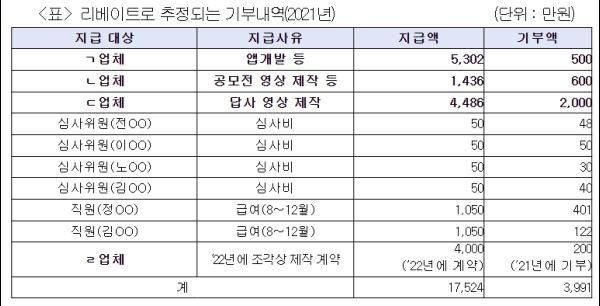 기념사업회는 이와 함께, ㄴ업체와 ㄷ업체에 영상 제작 사업비로 각각 1천 4백만원, 4천 5백만원을 지급하고 기부금으로 6백만원과 2천만원을 받은 것으로 드러났으며, 온라인 공모전 심사비와 직원 인건비로 2천 3백만원을 집행하고, 당사자들로부터 7백만원을 기부받은 것으로 확인됐다.