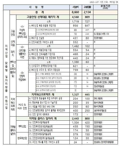 기존 지역혁신프로젝트, 고용안정선제대응 패키지 지원, 지역 고용위기대응 지원 사업에 올해부터 지역형 플러스 일자리사업이 추가 됐으며, 시는 컨소시엄 구(남동,부평,서구) 및 사업 운영기관들(10개 기관)과 3월초 약정을 체결하고 사업을 추진할 계획이다.