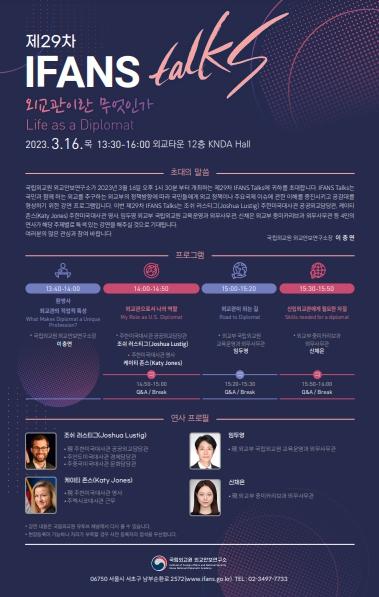 2013년 5월 이후로 개최되어 온 IFANS Talks는 금회가 29번째로서, 국제이슈, 공공외교, 국제기구진출 등에 관심 있는 고등학생, 대학생 등 약 100여명이 참석할 예정이다.