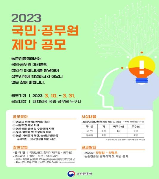 농촌진흥청은 3월 10일부터 3월 31일까지 학생, 시민, 공무원 등 전 국민을 대상으로 ‘2023년 국민?공무원 제안 공모전’을 실시한다고 밝혔다.