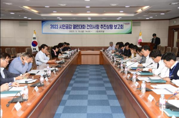 이번 보고회는 코로나 19 거리두기 완화 이후 23개 읍면동 순회방식으로 진행된 ‘2023년 시민공감 열린대화’에서 건의된 사항에 대해 부서별 추진 상황을 점검하고 논의하는 자리였다