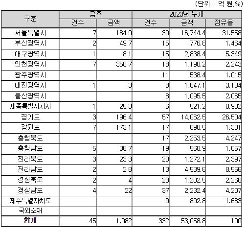 지역별로는 인천광역시 351억 원, 경기도 196억 원, 서울특별시 185억 원, 그 밖의 지역이 350억 원이다.