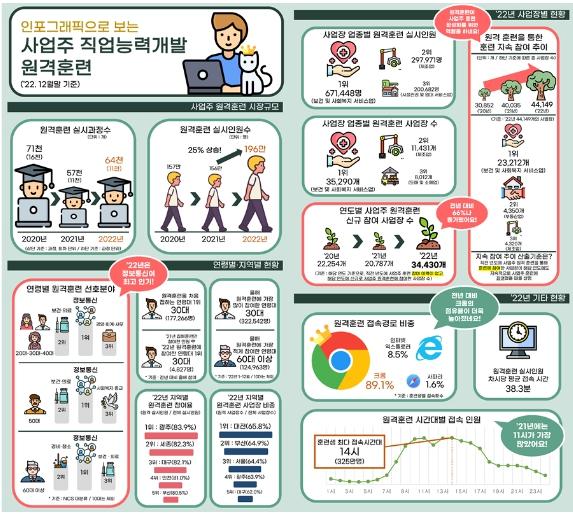 한국산업인력공단은 2022년도 사업주 직업능력개발 원격훈련 현황의 인포그래픽 안내자료를 발표했다.