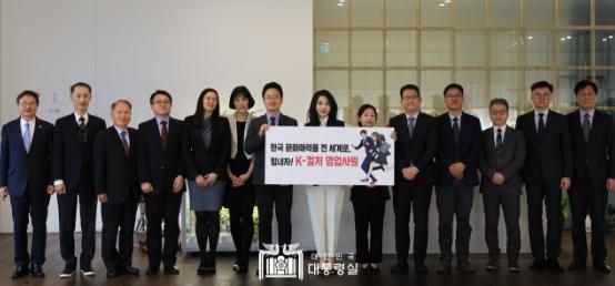 김 여사는 참석자들과 함께 ‘K-컬처 영업사원’ 웹툰 캐릭터가 그려진 팻말을 들고 기념사진을 촬영하면서 “저도 우리 문화의 매력을 알리기 위해 여러분들과 함께 뛰겠다”는 뜻을 밝혔다.