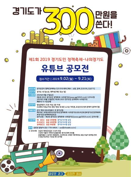 경기도는 오는 9월 21일까지 ‘제1회 경기도민 정책축제-나의경기도’ 홍보동영상 유튜브 공모전을 개최한다고 5일 밝혔다.