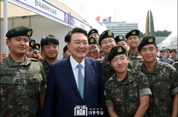 대통령이 박람회장 부스를 이동할 때마다 군복을 입은 장병들은 대통령 주변으로 몰려와 “충성”하며 거수경례했다. 대통령은 장병들에게 소속은 어디인지 물으며 한명 한명과 악수를 하면서 국가 안보를 위해 고생하는 장병들을 격려했다. 대통령은 또한 장병들의 사진 촬영 요청에 흔쾌히 응하며 즉석에서 기념 촬영을 했다. 이에 장병들은 대통령에게 “감사합니다”를 외치며 거수경례했다.
