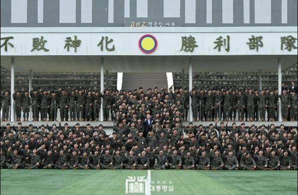 이어, 대통령은 사단 사열대로 이동해 현장에 모인 500여 명의 사단 장병들을 격려하며 기념사진을 촬영했다. 대통령은 사단 장병들에게 "국군 장병 여러분 덕분에 국민들께서 명절 연휴에 편안히 쉬고 재충전할 수 있다. 국방, 안보는 국가 기능 중 가장 중요하며, 국가경제는 국가 안보 위에서만 설 수 있는 것"이라고 말했다. 이어 "여러분의 노고가 국가경제의 버팀목이 된다. 여러분의 임무와 위치에 무한한 자부심을 가지고 군복이 명예가 되고, 자랑스럽게 생각할 수 있도록 최선을 다할 것"이라고 재차 강조했다. "인생의 가장 아름다운 시기에 국가를 위해 헌신하는 지금 이 시기가 여러분들에게 먼 훗날 크나큰 영광과 자랑이 되도록 확실히 챙기겠다"며 "국민을 대표해서 감사하고 늘 건강하길 바란다"고 덧붙였다.