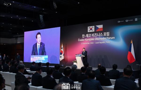 체코를 공식 방문 중인 윤석열 대통령은 오늘(현지시간 9. 20, 금) 오전 프라하 시내 호텔에서 열린 ?한-체코 비즈니스 포럼?에 참석했다. 오늘 포럼은 양국의 경제협력 비전을 모색하고 우의를 증진하기 위해 대한상공회의소, 체코상공회의소, 체코산업연맹이 공동으로 개최했다.