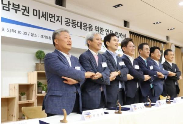 오산시는 5일 오전 경기도청에서 경기도 및 화성시. 평택시. 이천시. 오산시. 안성시. 여주시(이하 경기도 및 남부권역 6개시)와 미세먼지 공동협의체 협약을 체결했다.