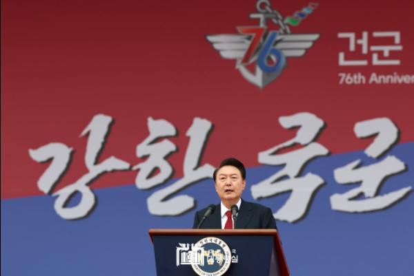 이어서, 대통령은 북한의 끊임없는 위협과 도발에 단호하게 맞서, 국군이 국가와 국민을 수호하는 막중한 임무를 수행하고 있다며, 우리 국군의 뜨거운 애국심과 충성심이 오늘날 우리가 누리는 자유와 번영의 든든한 토대가 된 것임을 강조했다.
