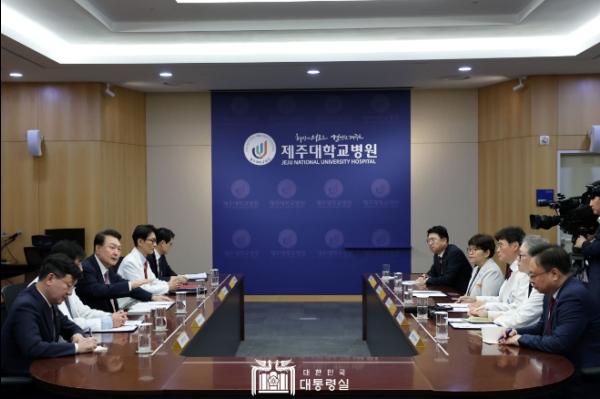 이에 최국명 병원장은 “지역적인 한계로 인한 의료인력 수급 어려움과 코로나19 및 전공의 이탈로 인해 심각한 재정 적자를 겪고 있다”며 “언제까지 이런 상황을 지속할 수 있을지 걱정되는 상황이지만, 대통령께서 이렇게 말씀해주시니 든든하다”고 말했다. 또한 최 병원장은 “제주대병원이 정부의 필수의료 정책에 적극 참여하고, 상급종합병원으로 지정될 수 있도록 지역 거점 병원으로서의 역할에 최선을 다하겠다”고 말했다.