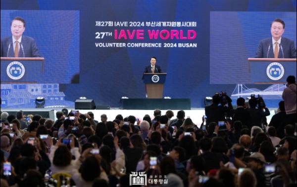 윤석열 대통령은 10월 22일 오후 부산광역시에서 개최된 ?제27회 IAVE 2024 부산세계자원봉사대회?에 참석해 전 세계 90여 개국 800여 명의 자원봉사자를 격려하고 대회 개최를 축하했다.