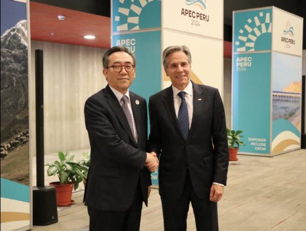 조태열 외교부 장관은 11월 14일 오후 아시아태평양경제협력체(APEC) 각료회의가 개최되고 있는 페루 리마에서 안토니 블링컨(Antony J. Blinken) 미국 국무장관과 한미 외교장관회담을 개최하고, 한미 관계, 한미일 협력, 북한 문제와 주요 지역 정세 등에 대해 의견을 교환했다.