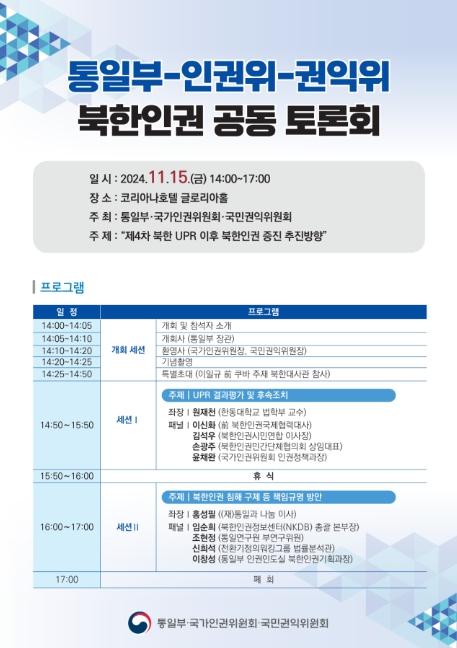 통일부는 11월 15일 코리아나호텔(서울 중구) 글로리아홀에서 국가인권위원회?국민권익위원회와 공동으로 '통일부-인권위-권익위 북한인권 공동 토론회'를 개최한다.
