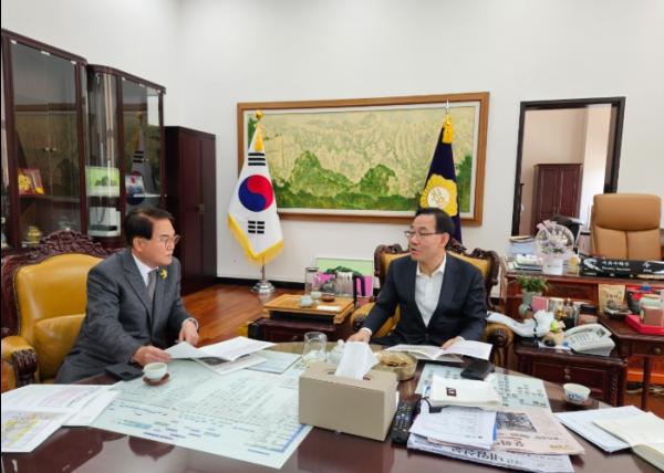 이날 면담에서는 △경산~청도 간 도시 광역철도망 구축 △청도 자연드림파크 일반산업단지 조성 △덕암지구 하수관로 정비사업 △각남면 녹명1리 하수관로 정비사업 △실경 뮤지컬 '화랑 천년의 문턱에 꽃비 내리다'제작 △유아친화형 국민체육센터 건립사업 △풍각지구 배수개선사업 등 지역 발전을 위한 주요 사업들을 상세히 설명했고, 국비 확보를 위해 힘을 모아 줄 것을 적극 요청했다.