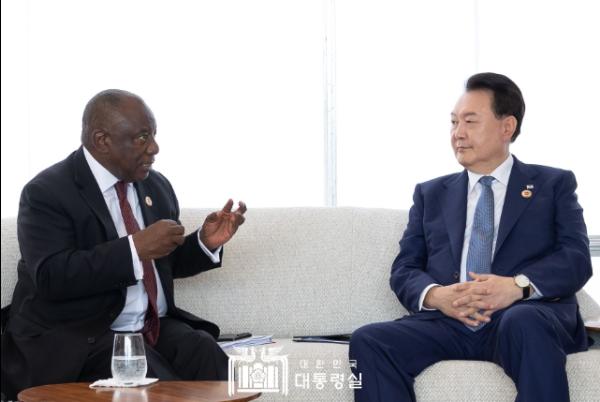 G20 정상회의 참석을 위해 브라질 리우데자네이루를 방문 중인 윤석열 대통령은 11월 19일 '마타멜라 시릴 라마포사(Matamela Cyril Ramaphosa)' 남아프리카공화국 대통령과 정상회담을 갖고, 양국 간 실질 협력 방안과 지역 및 글로벌 현안에 대해 의견을 교환했다.