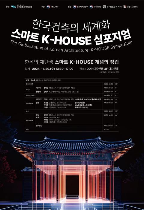 이번 심포지엄은 ‘한옥의 재탄생 - 스마트 케이(K)-하우스(HOUSE) 개념의 정립’을 주제로 개최한다. 인공지능, 디자인, 전통 한옥 등 다양한 분야의 전문가들이 참여해 앞으로의 한옥의 현대적 발전방향을 모색한다.