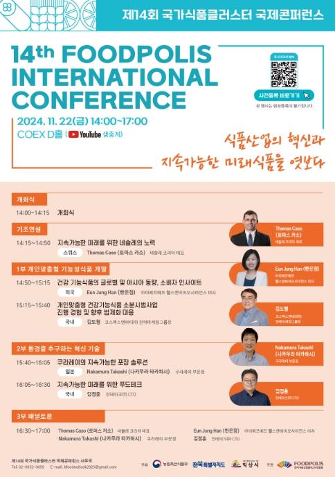 농림축산식품부가 주최하고, 한국식품산업클러스터진흥원이 주관하는 '제14회 국가식품클러스터 국제학술대회(콘퍼런스)'가 11월 22일 14시부터 서울 코엑스 D홀에서 개최된다.