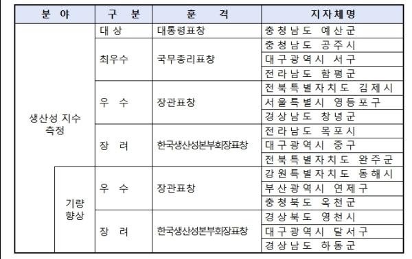 종합생산성이 높은 지자체로 대상(대통령표창)은 충청남도 예산군이 차지했으며, 최우수상(국무총리표창)은 충청남도 공주시, 대구광역시 서구, 전라남도 함평군이 수상했다.