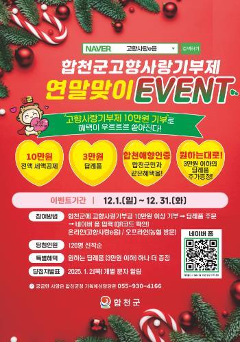 합천군은 고향사랑기부제 활성화를 위해 12월 1일부터 31일까지 “연말맞이 고향사랑기부제 이벤트”를 진행한다.