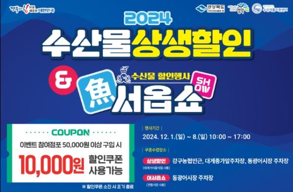 어서옵쇼 수산물 할인 행사는 총 7,200장의 쿠폰이 마련돼 동광어시장 37점포, 강구항어시장 31점포에서 사용할 수 있다.