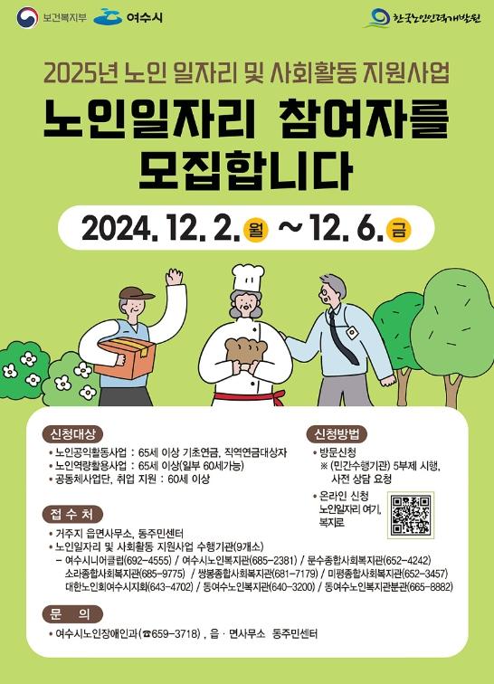 여수시는 2025년 노인일자리 및 사회활동 지원사업 참여자 9,300명을 12월 2일부터 12월 6일까지 모집한다고 28일 밝혔다.