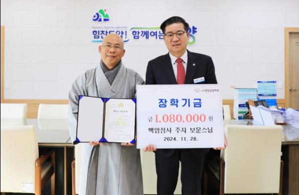 함양군은 지역사회에 온정을 더하는 장학금 기탁이 이어지는 가운데, 28일 백암정사 주지 보문 스님이 함양군청을 방문해 함양군장학회에 장학금 108만 원을 기탁했다고 밝혔다.
