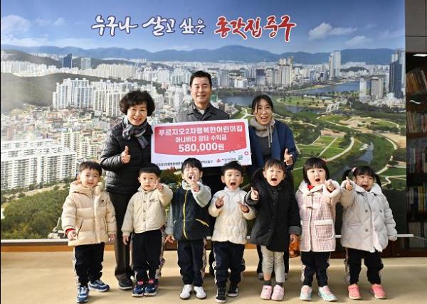 울산 중구 병영1동에 위치한 푸르지오2차행복한어린이집이 11월 28일 오전 9시 30분 중구청 구청장실을 찾아 울산사회복지공동모금회를 통해 이웃돕기 후원금 58만 원을 전달했다.