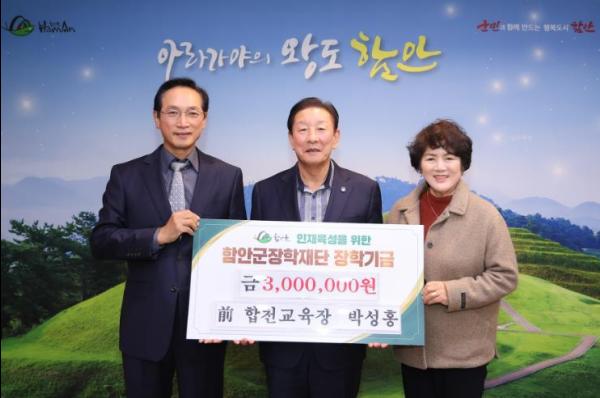 함안군 법수면 황사리 출신의 박성홍 전 합천교육장은 고향인재육성을 위한 장학기금 300만 원을 지난해에 이어 올해도 함안군장학재단에 기탁했다.