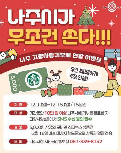 전라남도 나주시는 연말정산 시즌에 맞춰 12월 1일부터 15일까지 고향사랑기부제 참여 감사 이벤트를 진행한다고 29일 밝혔다.