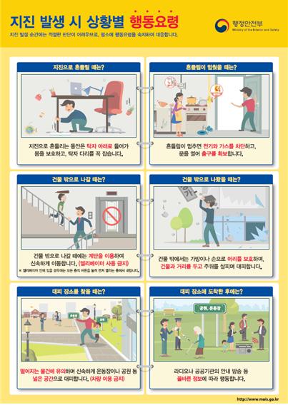 김계조 행정안전부 재난안전관리본부장은 “지진은 예고 없이 발생하며, 땅이 흔들리거나 건물이 흔들리는 현상 등이 동반되기 때문에 평소부터 지진에 대비한 행동요령을 숙지하고, 지진이 감지되면 당황하지 않고 침착하게 행동하여 주길 바란다.”라고 말했다.