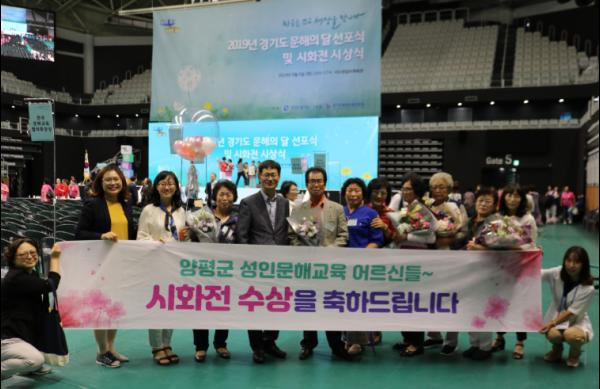 양평군(군수 정동균)에서 운영 중인 성인문해교육 한글교실의 학습자 9명이 경기도와 경기도평생교육진흥원이 주최한 ‘2019년 경기도 문해의달 선포식 및 시화전 시상식’에 참가하여수상의 기쁨을 안았다.