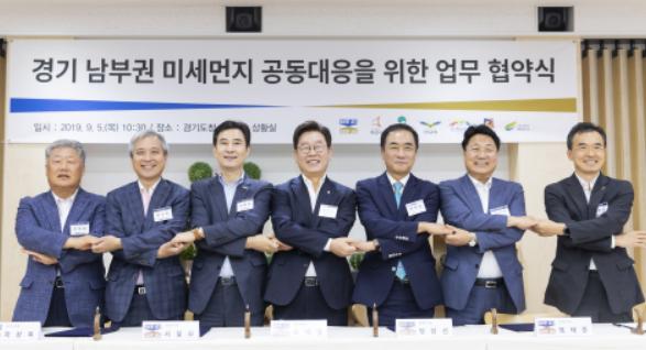 5일 오전 경기도청 신관 2층 상황실에서 경기도와 경기남부 지자체 이천·평택·화성·오산·안성·여주 6개 시가 미세먼지 공동협의체 구성 업무협약을 체결했다.