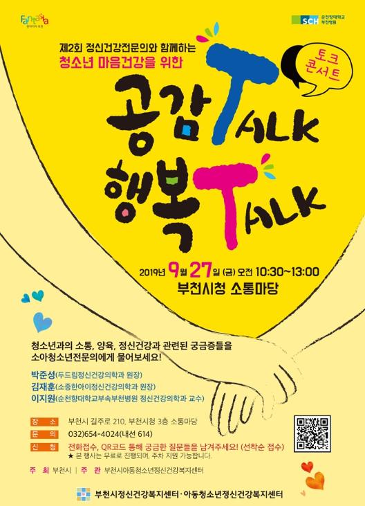 부천시보건소와 부천시아동청소년정신건강복지센터는 오는 9월 27일 시청 소통마당에서 ‘2019년 정신건강전문의와 함께하는 정신건강 토크콘서트’ 를 개최한다고 6일 밝혔다.