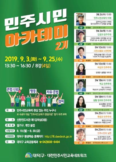 한편 구는 지난 5월 ‘대덕구 민주시민성 정립을 위한 포럼’을 개최한 바 있으며, 민주시민 아카데미 수료자를 대상으로 교육가 과정도 개설할 계획이다.