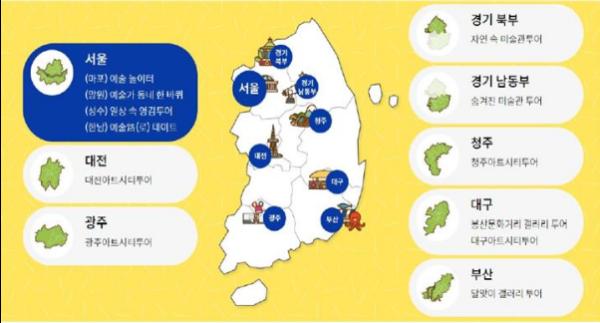 미술주간에는 도보(무료) 또는 버스(유료)로 여러 전시공간을 찾아가는 ‘미술여행’ 프로그램도 운영한다. 특히 올해는 여행 권역을 수도권에서 전국 범위로 확장해, 서울, 부산, 대구, 광주 등 8개 지역에서 총 12개 여행 길(코스)을 마련하고 작년의 2배 규모로 진행한다. 미술여행에는 전문 전시해설사가 동행하며, 여러 전시를 관람할 수 있다. 참가 신청은 미술주간 공식 누리집(www.artweek.kr)에서 받고 있으며, 각 여행길은 선착순으로 마감한다.